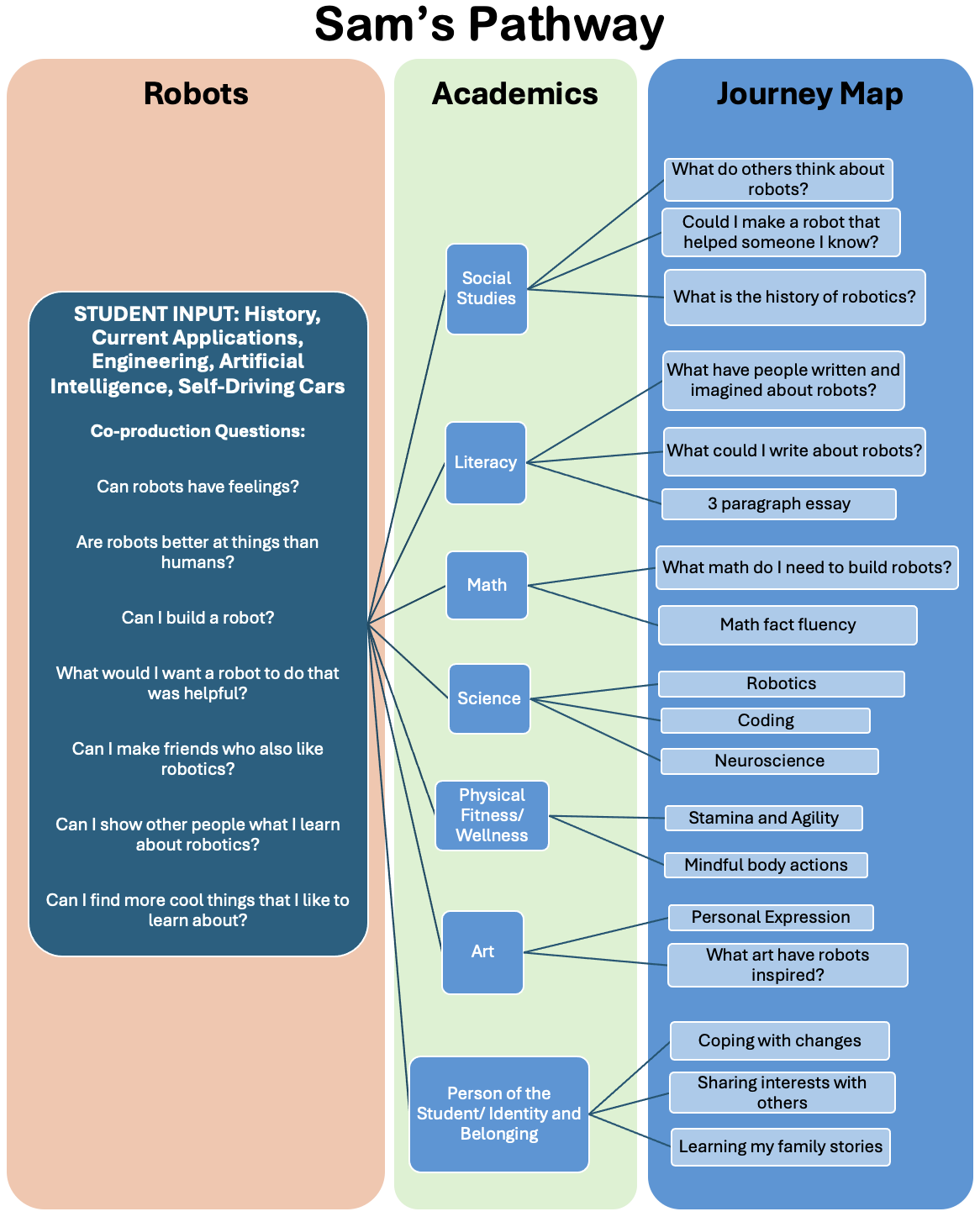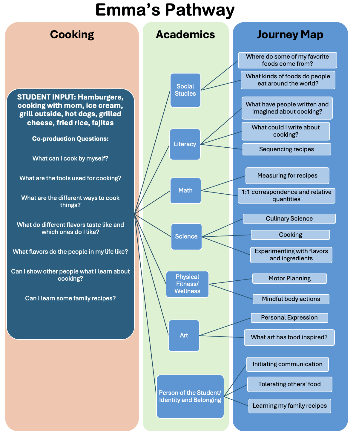 Below is an example of Pathway maps. The first map was created for Sam, who had a deep passion for Robotics. Sam's Pathway addressed a co-produced series of inquiries while ensuring their general academic needs and areas for social-emotional growth were also included. By engaging Sam in the planning process, Sam was able to achieve more in one school year than in the previous three, both with regard to academic progress and relationship development. The second map was created for Emma, who intensely enjoyed cooking and had yet to find academics accessible. Emma's Pathway addressed a series of co-produced inquiries, layering general academic needs, social-emotional growth goals, and meaningful connections to personal interests throughout her curriculum. By including meaningful interests within the scope of academic concepts, Emma was able to effectively access her daily curriculum for the first time.